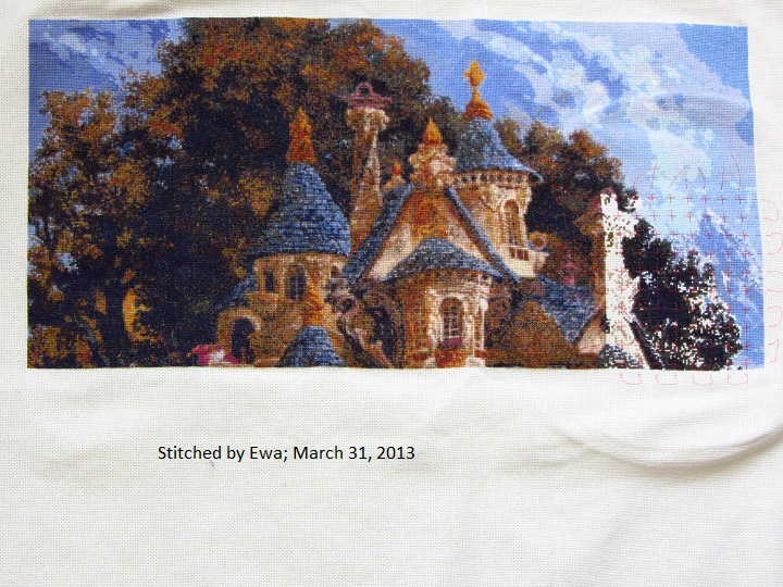 I'm a few hundred stitches short of 3,000 on the page but I full anticipate to get there tonight or tomorrow, at the rate I've been going anyway. And I'm very excited to see the outline of the college appear on this page. Woo hoo! A little tower blowing smoke is going to make its appearance. You can see a bit of the smoke on the page above it.