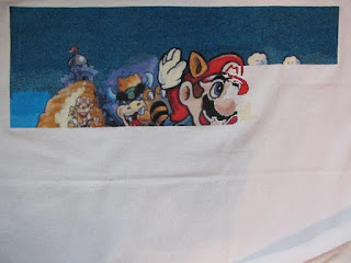 Foot rubs were a motivational success. Except for the part where we were super busy all weekend and I only stitched about 2 hours Saturday and Sunday. So I added a little bit more time on Monday (only about 2 hours) and got this much done on Mario.