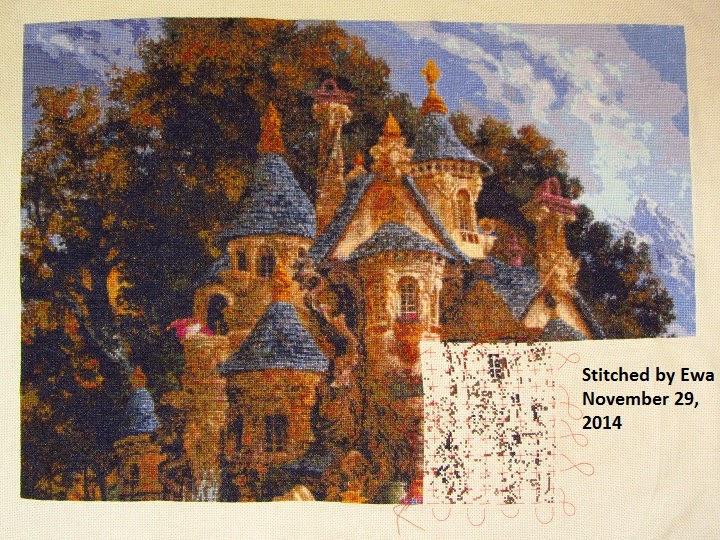 Making some good progress on it but not much else I have to say. That's because I have a goal to finish this project by next Christmas, and now with grad school being done I might actually finish it! Another factor is that I'm knitting a thank you scarf for my flower girl for Christmas and, quite honestly, it's extremely difficult. It's a lace pattern that has 32 rows in every repeat with 22 repeats total, however each row is different from the last one so I can't really memorize the pattern. I should be finished with it soon-ish and then I can get back to my regularly scheduled stitching but in the meantime at least I'm getting some College done! I'm pretty happy with this page finish. You can start to see the tops of the heads of the little wizards who will fully appear in the last row of pages! Two more full and one partial (which I will do with the full page) left in this row and then it'll be the final countdown!